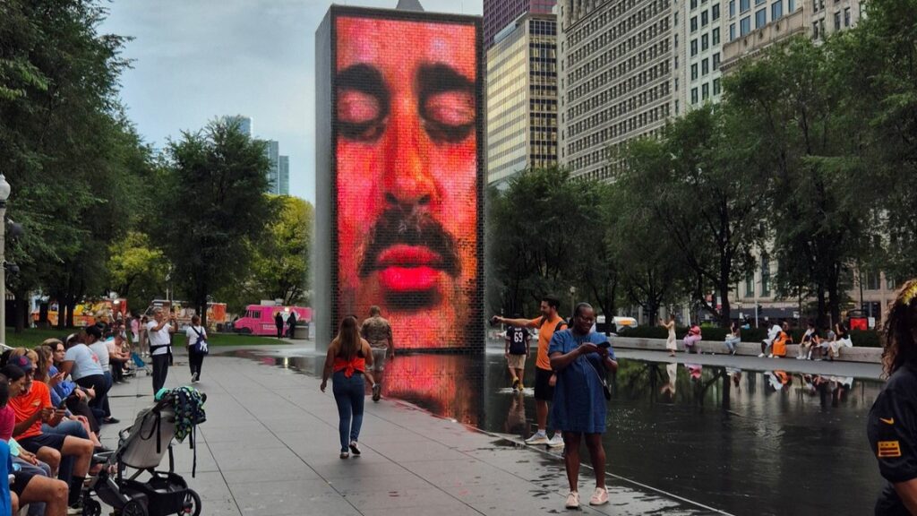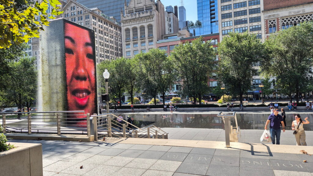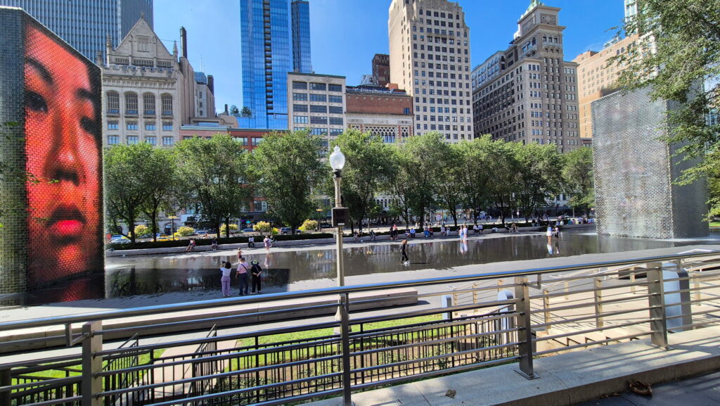 Crown Fountain – Fontanna składa się z czarnego granitowego basenu odbijającego światło, umieszczonego między parą szklanych ceglanych wież. Wieże mają 15,2 m wysokości i wykorzystują diody LED do wyświetlania cyfrowych filmów na ich wewnętrznych powierzchniach. Na wieżach wyświetlane są twarze mieszkańców Chicago. Dwie losowo wybrane twarze „rozmawiają” ze sobą. Twarze te reprezentują różnorodność miasta zarówno pod względem etnicznym, jak i wiekowym.