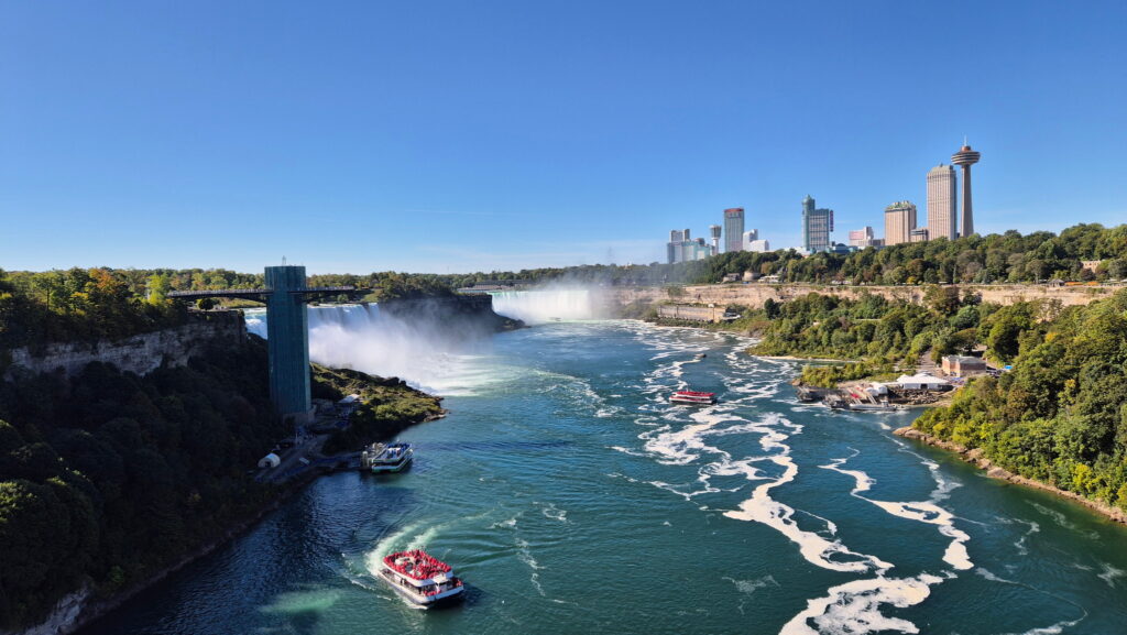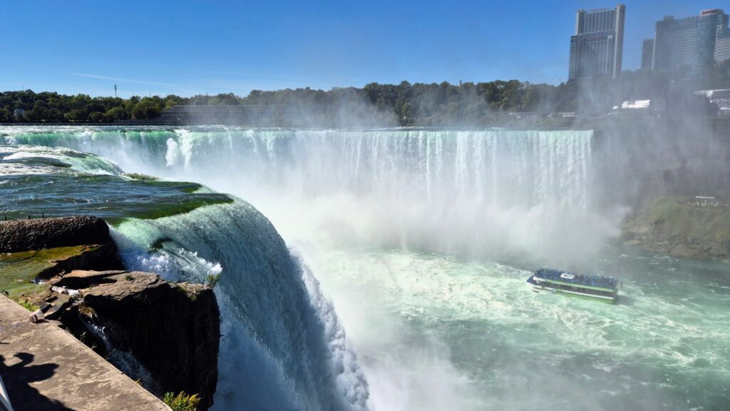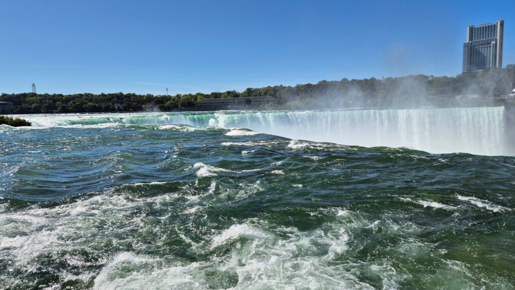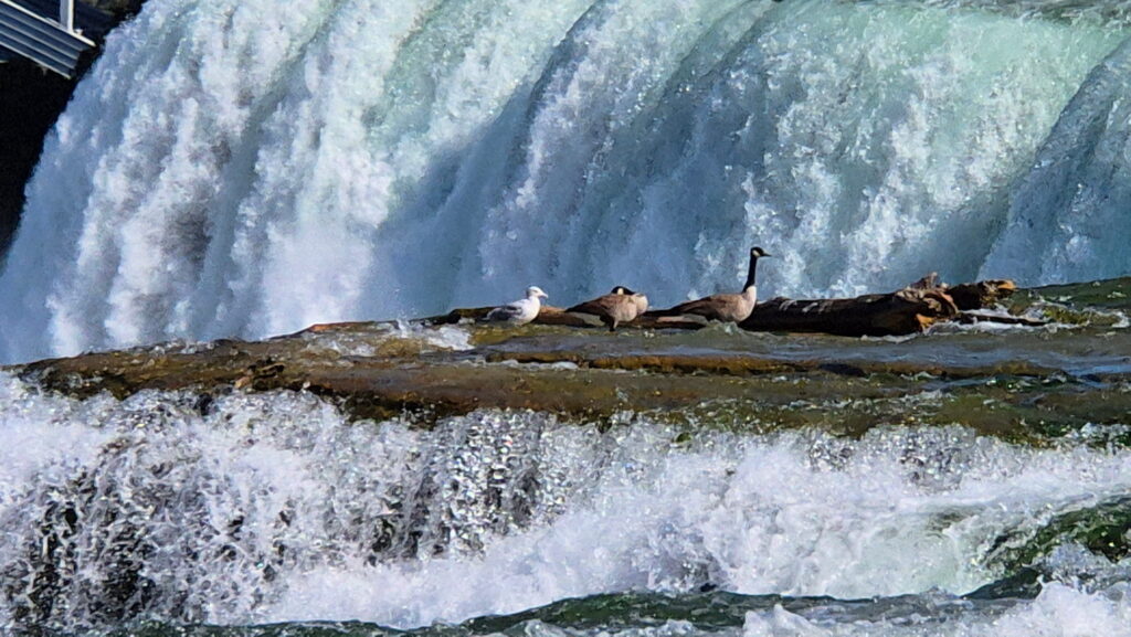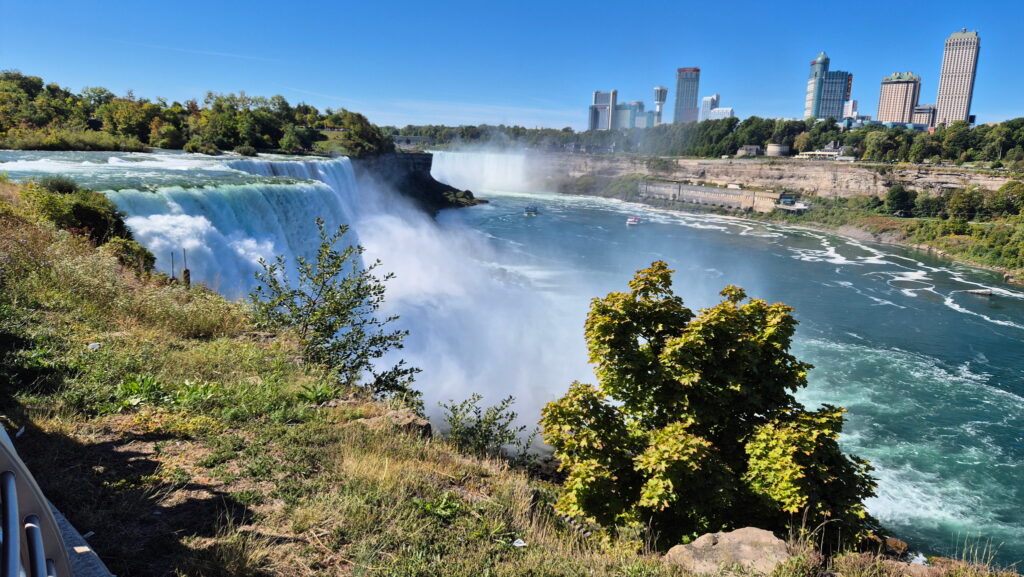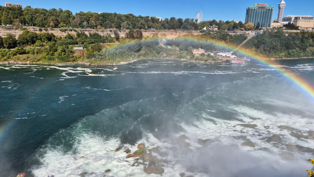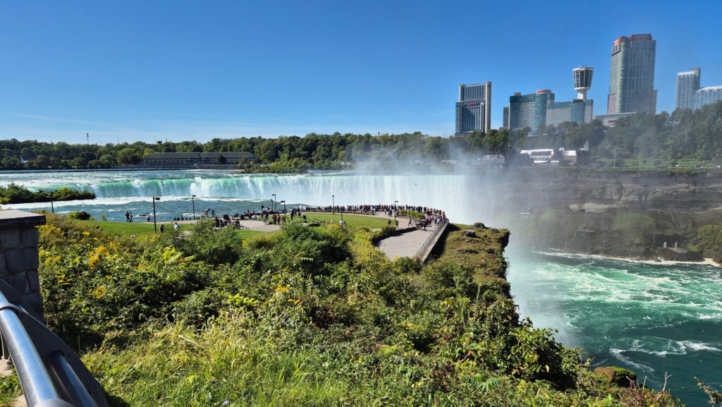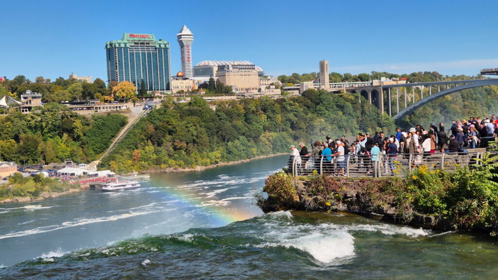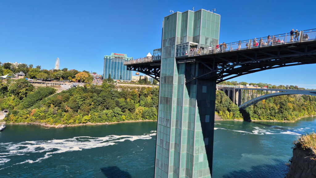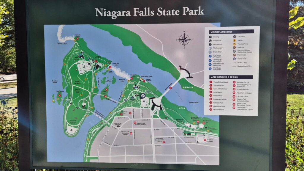 Do USA udaję się pieszo przez most Rainbow Bridge. Piąty raz wkraczam do USA ale teraz trzeba za to zapłacić 1 USD – to nie byłby problem ale kanadyjski automat chce 4 x 25 centów. Gdzieś w plecaku je mam, tylko gdzie? Na szczęście na automacie jest mały znaczek karty płatniczej – udało się nią zapłacić. Po przejściu mostu i amerykańskiej kontroli granicznej można wejść do Niagara Falls State Park – obejrzeć te same wodospady z innej perspektywy – chyba gorszej.