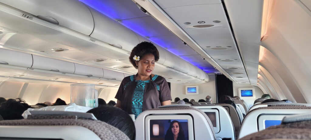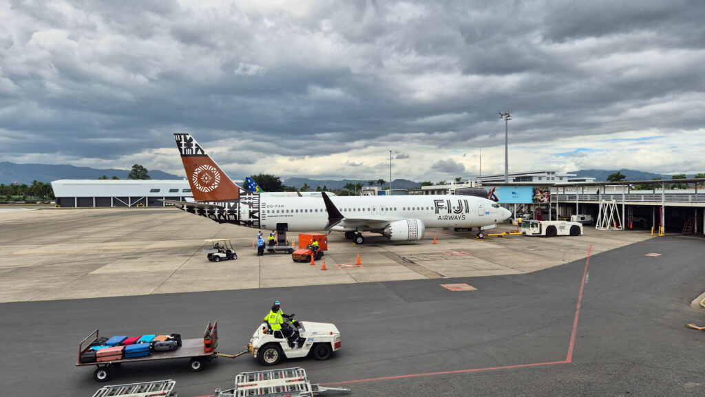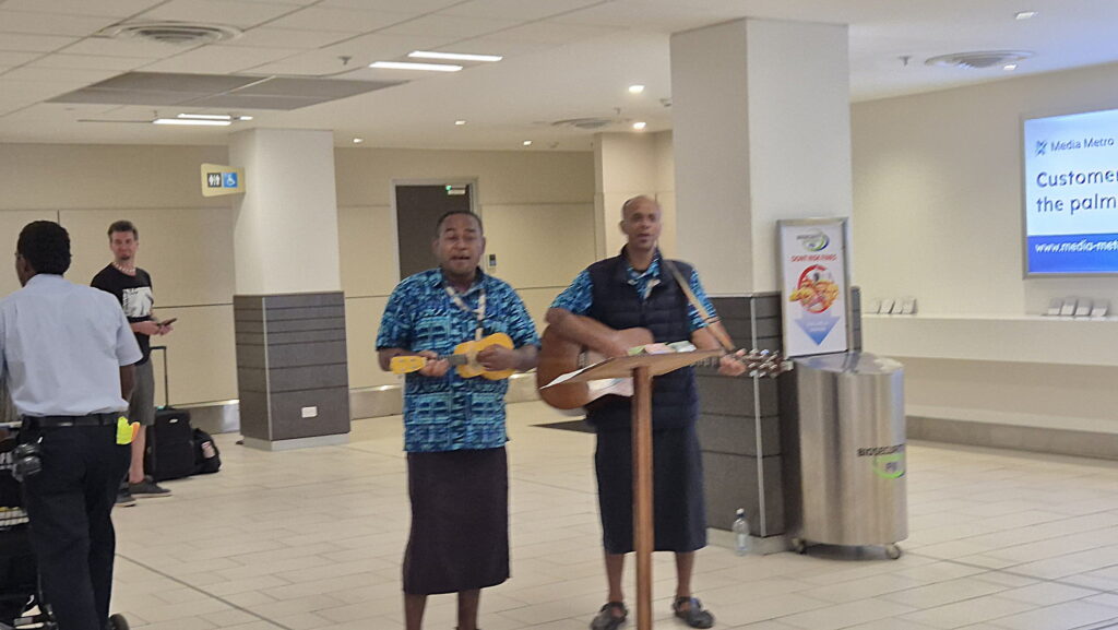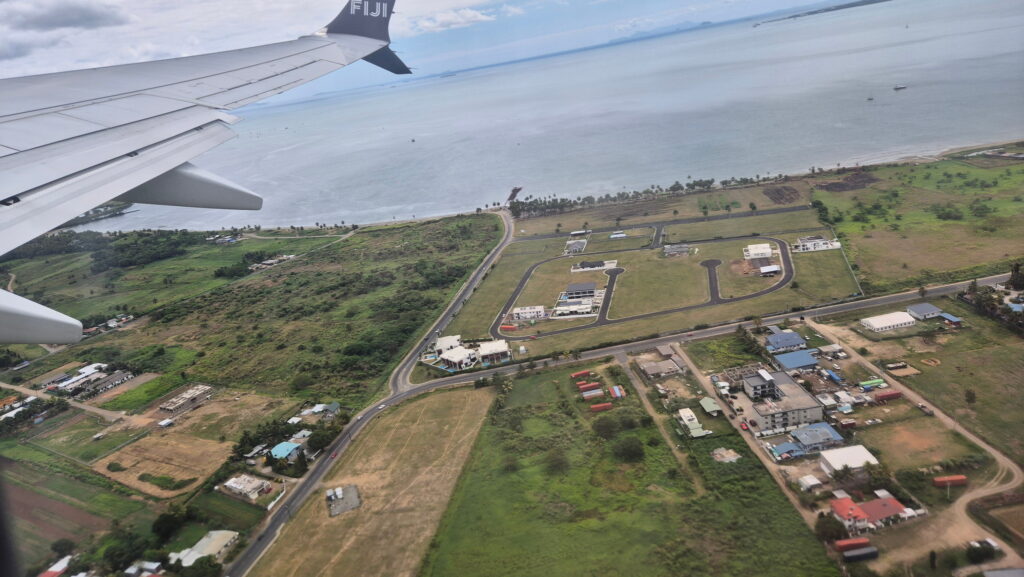 Lot był przyjemny, egzotyczne linie lotnicze Fiji Airways, stewardesy egzotycznie przystrojone, egzotyczne piwo na pokładzie i powitanie na lotnisku przez egzotyczną kapelę. Widoki z okna samolotu też egzotyczne.