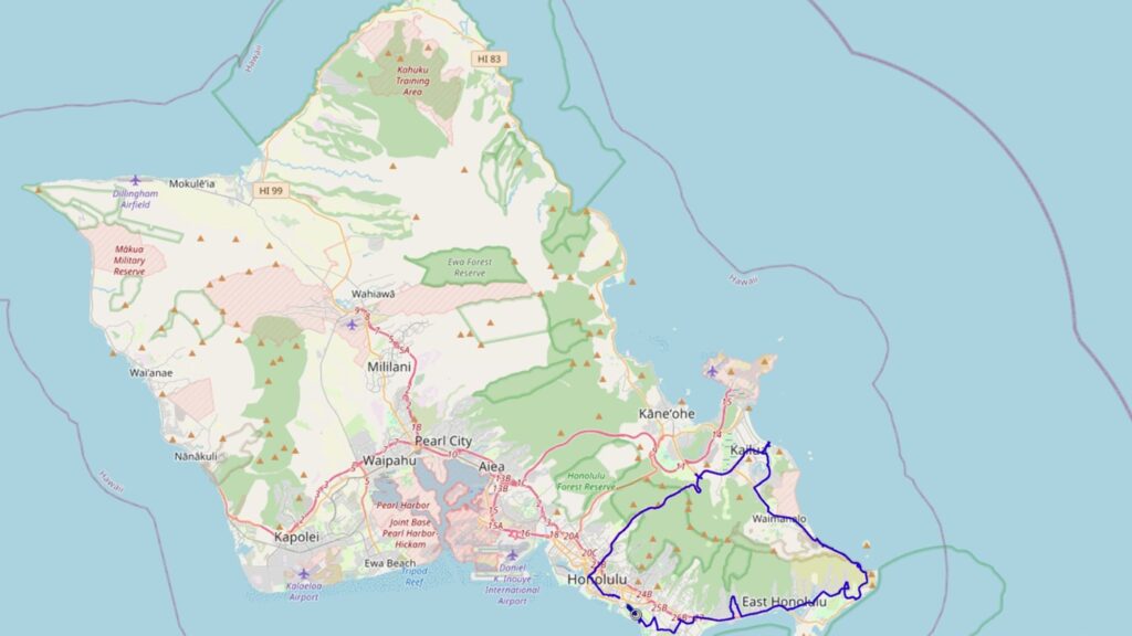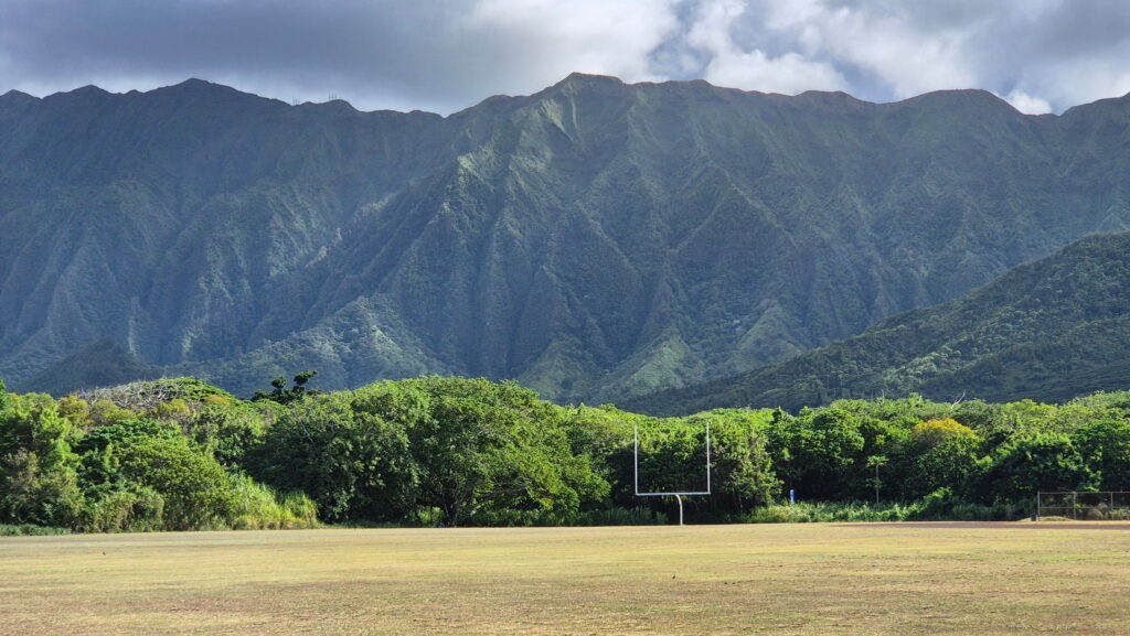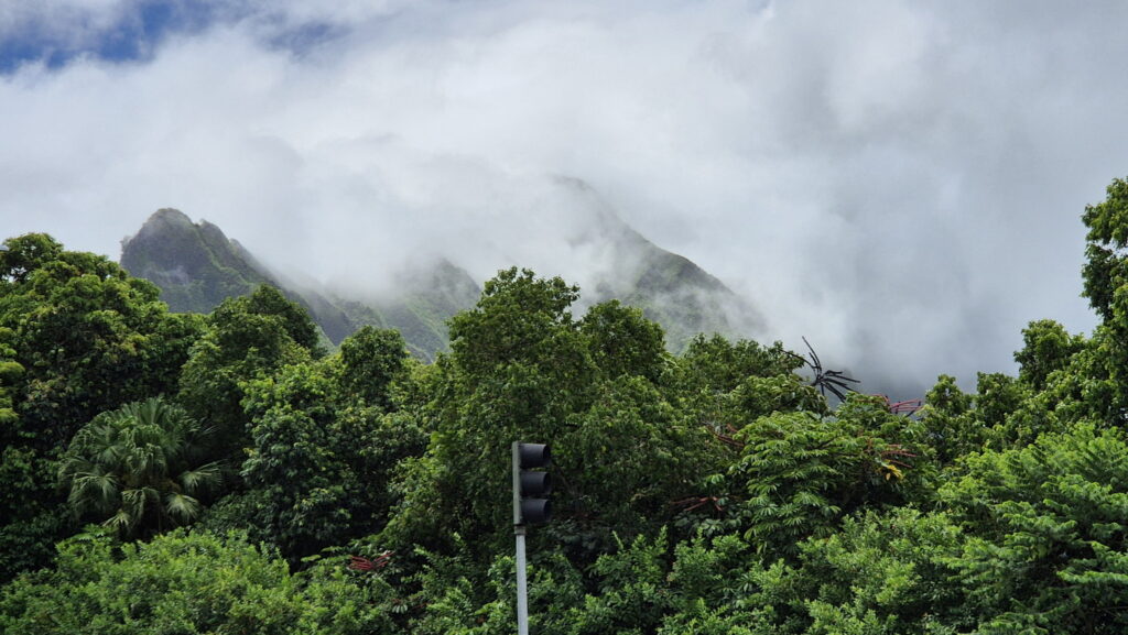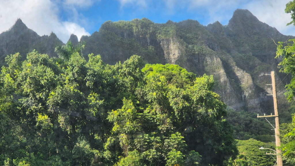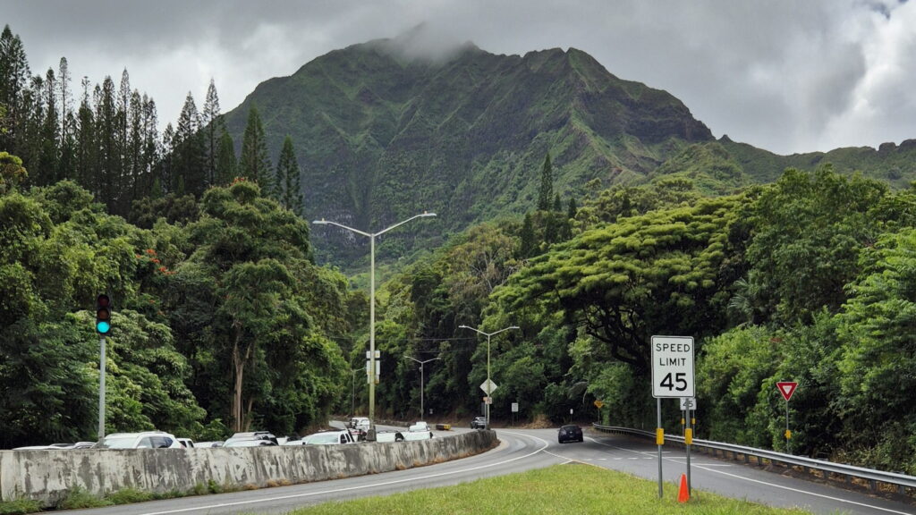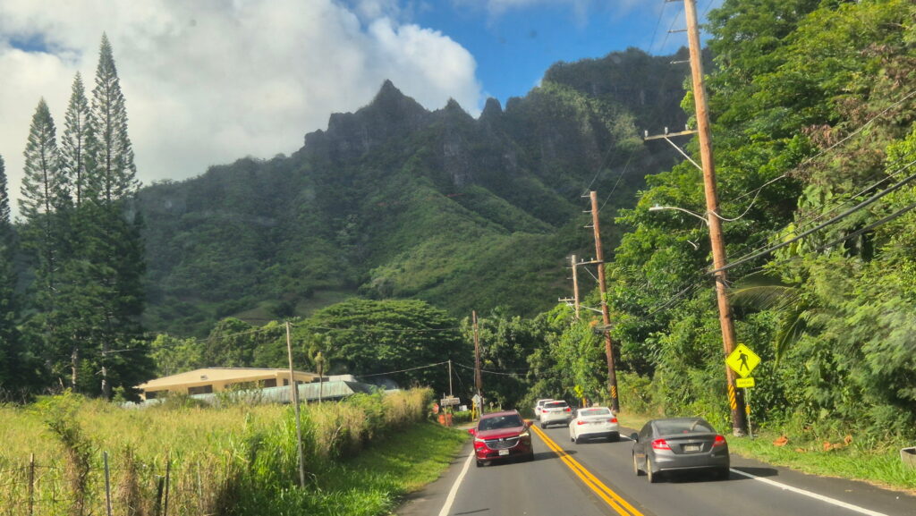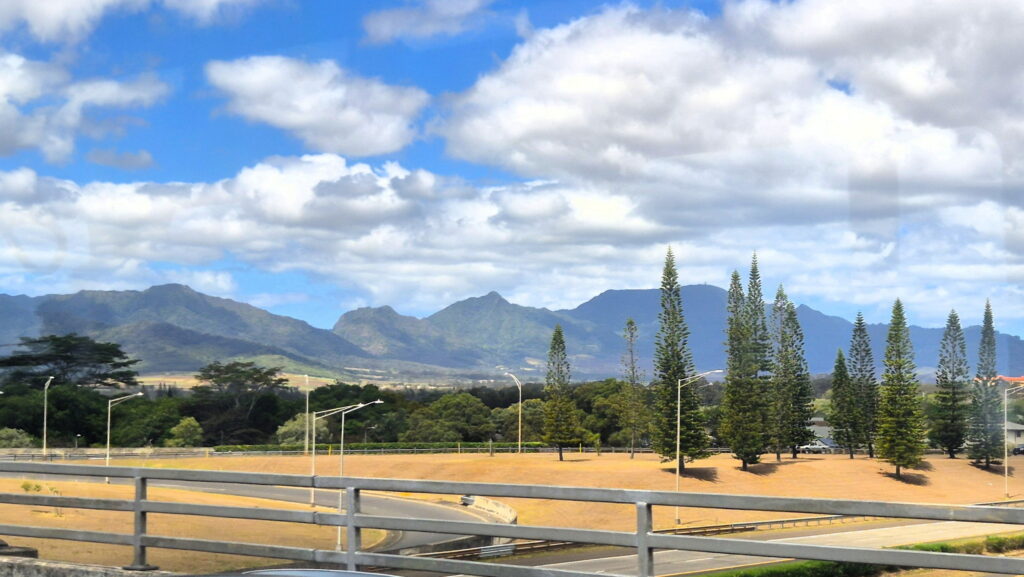 Jadąc autobusem nr 66 przejeżdza się przez góry. Niestety jedzie on wtedy autostradą Pali Highway na której nie ma przystanków (nawet przy punkcie widokowym – dojazd tylko samochodem). Wysiadłem na pierwszym przystanku po minięciu przełęczy w miejscu zwanym Castle Junction. Widoki takie: