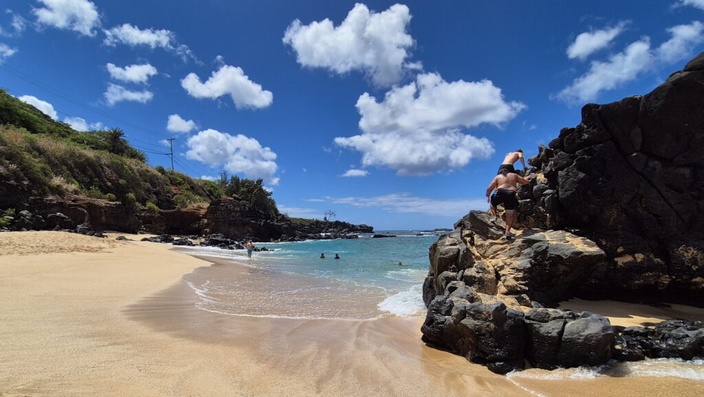 Plaża Waimea Bay – położona na północnym brzegu. W miesiącach zimowych występują tu największe i najbardziej niebezpiecze fale, sięgające ponad 9 m wysokości. Miejsce to jest najlepsze na świecie dla surferów. Jednak w miesiącach letnich spokojne fale zachęcają do przyjemnego pływania, a dzięki dużym rozmiarom plaża jest idealna do opalania. Jeśli jesteś wystarczająco odważny, możesz wspiąć się na „da big rock”, która jest popularnym miejscem do swobodnego skakania i ma platformy do skakania na wysokości 1,5-5,5 m.