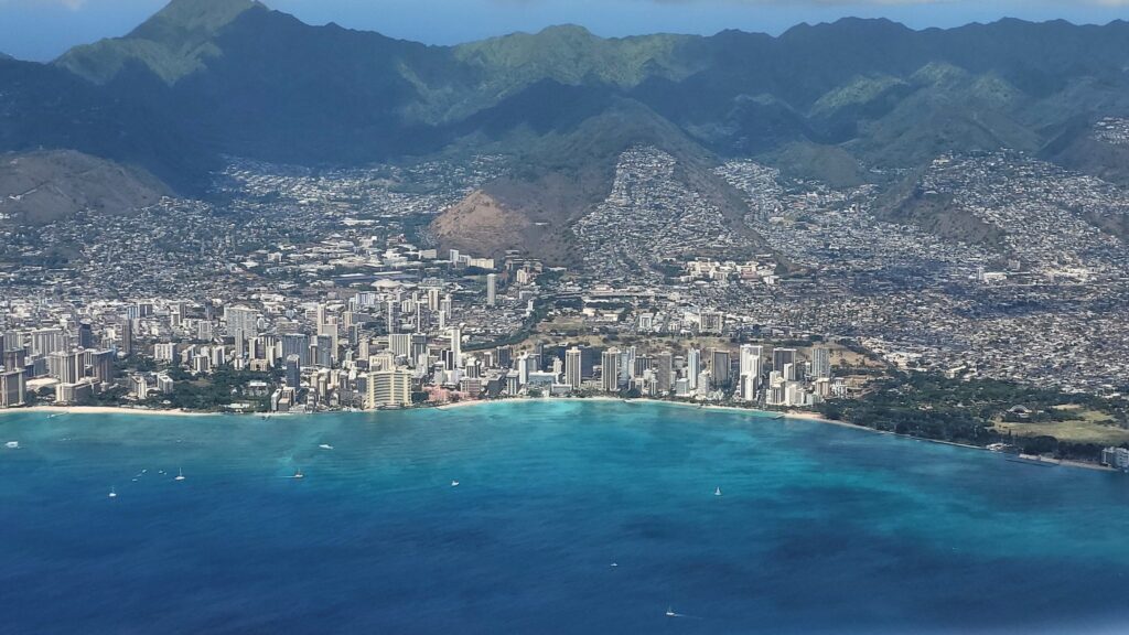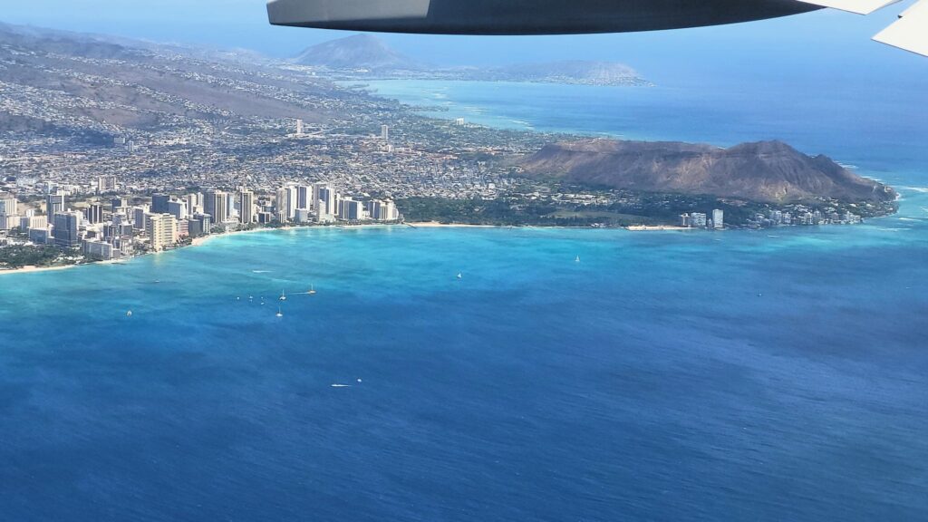 O godzinie 14 miałem pierwszy lot do San Francisco. Tam krótka przesiadka (1 godz. 22 min. – bez problemu) i drugi lot San Francisco – Toronto. Udało mi się jeszcze zrobić zdjęcia z samolotu na Honolulu.