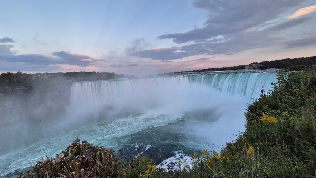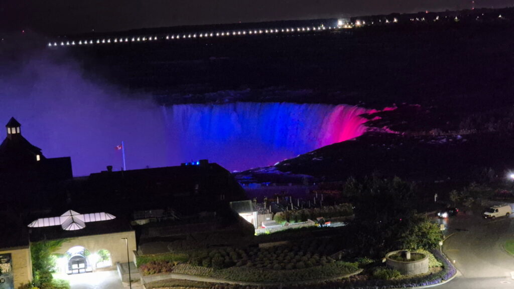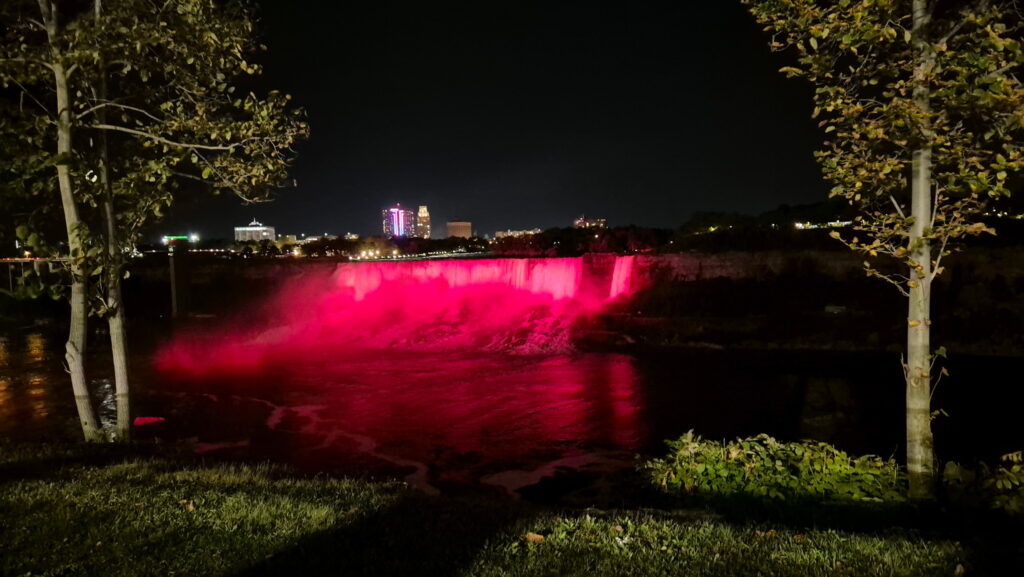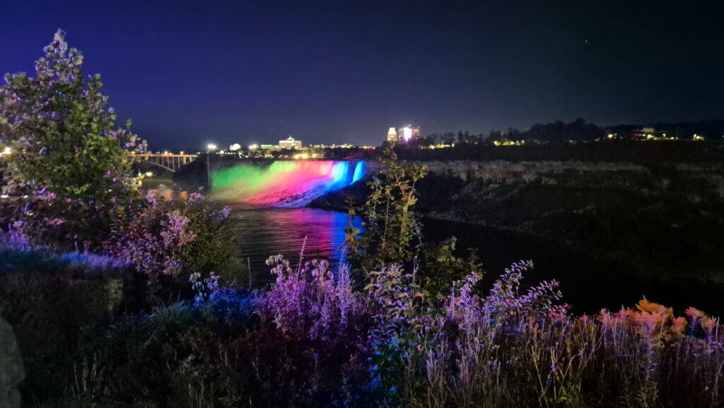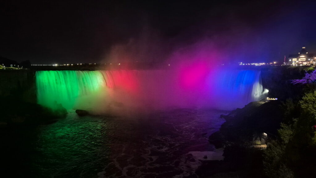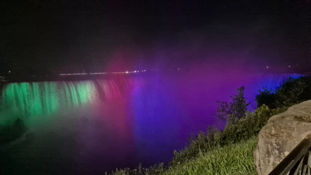 Wyjechałem z Toronto o 17:30, pod wodospadami byłem o 20:30. Akurat trafiłem na spektakl świetlny – podświetlone wodospady.