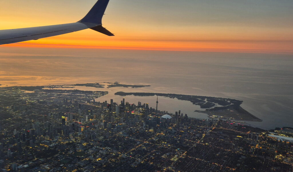 Po dwóch nocnych lotach w Toronto ląduje o godzinie 7.00. Znowu skróciłem sobie dobę o 6 godzin. Dla mojego organizmu to godzina 1.00 w nocy a nad Toronto właśnie wschodzi słońce.