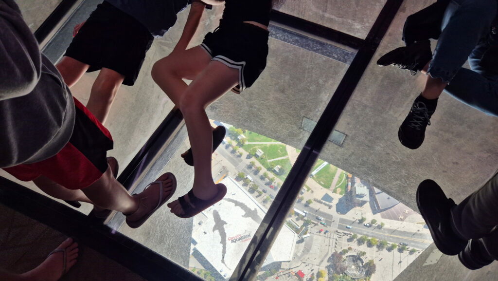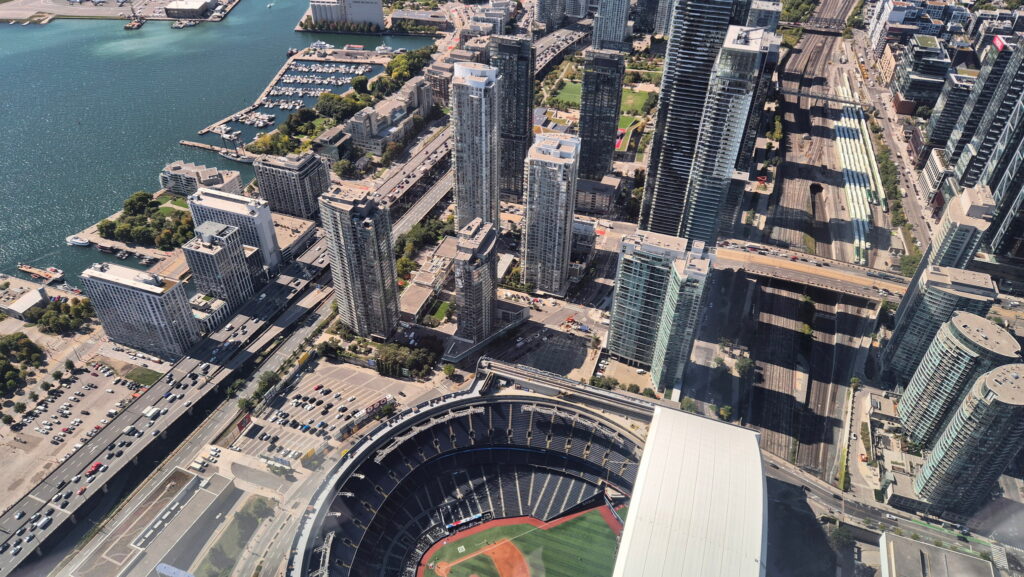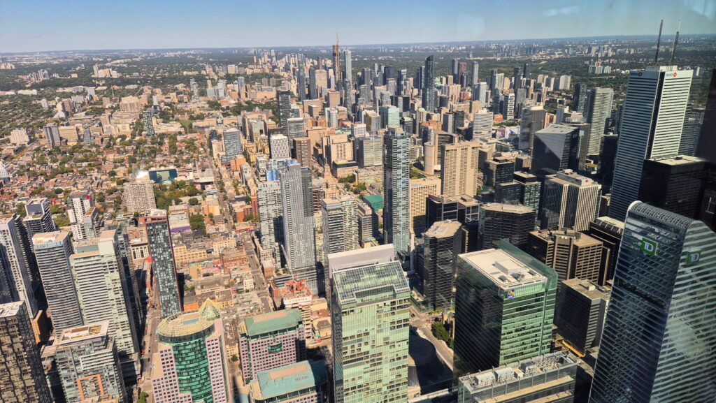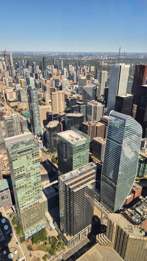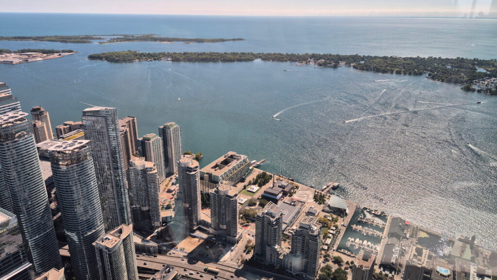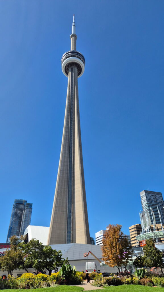 CN Tower – trzecia wieża na którą wjadę w czasie tej wyprawy. Ta jest najwyższa. Ukończona w 1976 roku CN Tower ma 553 metrów wysokości. Z platformy widokowej mieszczącej się na wysokości 346 m i przez szklaną podłogę zapewnia widok na centrum Toronto i panoramę miasta . Widok ten obejmuje wyspy Toronto, jezioro Ontario, a w odpowiednich warunkach wodospad Niagara. CN Tower była najwyższą wolnostojącą konstrukcją na świecie przez 34 lata.