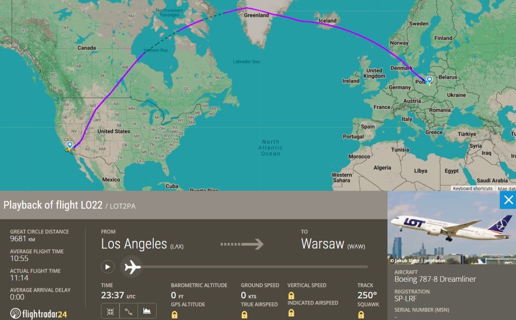13. Lot Los Angeles (TB) (śr. 16:35)- Warszawa (przylot czw. 13:10) 11h35 LOT B787-8 LO22 m.7J